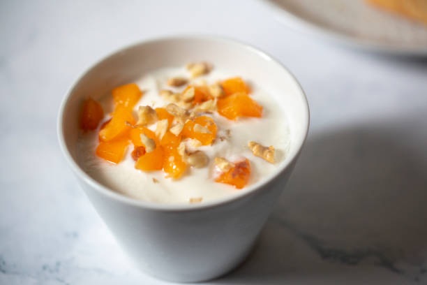 • Put the shrikhand in a ceramic bowl. Remove the stewed apricots from heat and put them on top of the shrikhand.